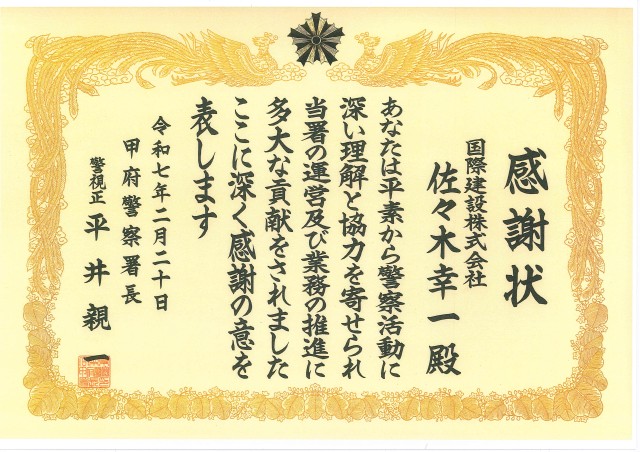 2025年6月4日に、甲府警察署管内建設業防犯協議会の目的を深く理解し、防犯活動を積極的に推進したとして、土木部深澤英雄取締役が受賞いたしました。