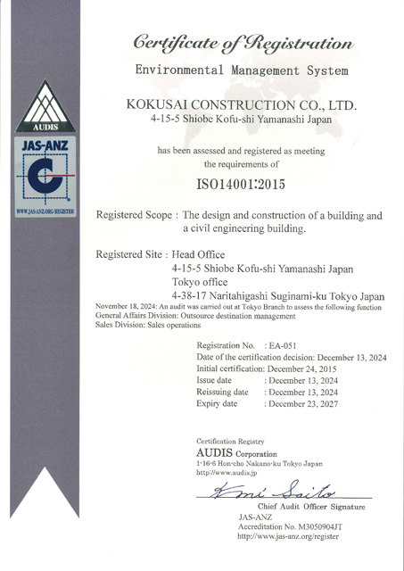 ISO9001とは国際標準化機構による品質システムの規格のひとつです。この規格に基づく当社品質システムの認証範囲は、建築物、土木構造物の設計及び施工でございます。